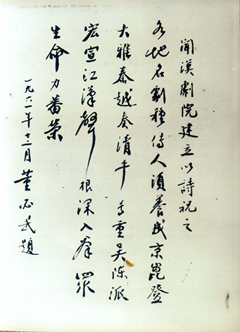 武漢漢劇院是全國有較大影響的藝術團體,其前身為武漢漢劇團。一九六二年在周恩來總理的關懷下,正式建院,國家副主席董必武贈詩:“京昆登大雅、秦越奏清平,尊重吳陳派,宏宣江漢聲,根深如群眾,生命力蕃榮”以示祝賀。